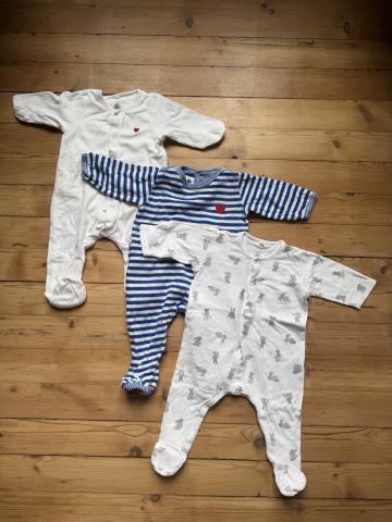 Lot de 3 pyjamas taille 6 mois, de marque Petit Bateau (achetés d’occasion à des amis).