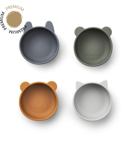 Optez pour ces bols enfant Blue Mix de chez Liewood. Conçus en silicone. Ornés d'oreilles d'animaux. Nombreux modèles disponibles.