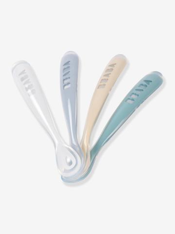 Lot de 4 cuillères 1er âge Soft sans BPA bleu/gris/ocre - Ultra souples et spécialement adaptées pour ne pas risquer d'irriter la petite bouche aux gencives délicates de bébé