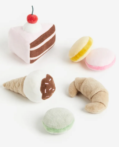 Ensemble exquis, composé de peluches matelassées en tissu polaire représentant des pâtisseries aux détails brodés. Des accessoires indispensables pour compléter un petit stand de salon de thé ou de bo...