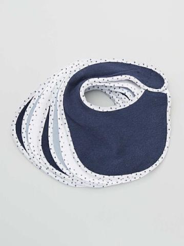 Un bavoir à scratch pour chaque jour de la semaine ! - Lot de 7 bavoirs en éponge - 100% coton - 3 bleu marine + 2 bleu gris + 2 blancs - Attache par scratch sur le côté - Biais imprimé 'étoiles' - Dimensions : 23 x 19 cm environ