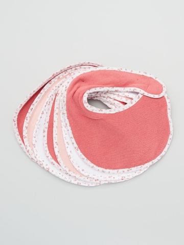 Un bavoir à scratch pour chaque jour de la semaine ! - Lot de 7 bavoirs en éponge - 100% coton - 3 rose foncé + 2 rose pâle + 2 blancs - Attache par scratch sur le côté - Biais imprimé 'fleurs' - Dimensions : 23 x 19 cm environ