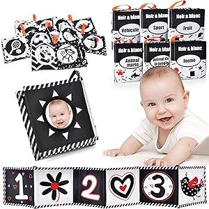 Black & White Lot de 7 Livres en Tissu pour bébé avec miroirs à Contraste élevé et Doux pour bébé - Noir et Blanc - Jouet éducatif.