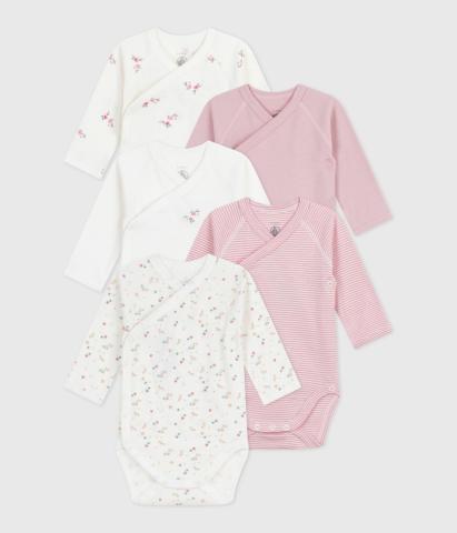 Lot de 5 bodies croisés manches longues fille en côte 1X1, une matière extensible et confortable.
