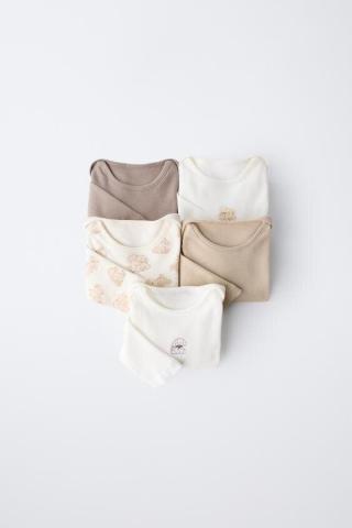 Lot de cinq bodys à col rond et manches longues. Fermeture par boutons-pression sur le bas. Imprimé chiots.