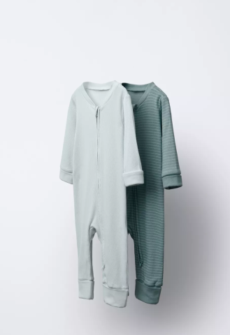 Lot de deux pyjamas à col rond et manches longues ajustable. Bas avec longueur ajustable et option de se transformer en chaussette, pyjama fermé. Fermeture zippée frontale.