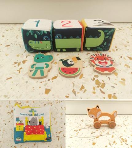 Ce produit est extrait d'une liste de naissance déposée sur Kadolog. Kadolog permet de créer des listes de naissance en toute liberté. Il est possible d'ajouter toutes vos envies cadeaux et de recevoir les dons directement sur votre compte. Avec les dons reçus, vous êtes alors libre d'aller acheter vos produits (comme ce 'Lot de jouets bébé ') où et quand vous le souhaitez.
