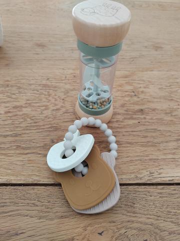 Ce produit est extrait d'une liste de naissance déposée sur Kadolog. Kadolog permet de créer des listes de naissance en toute liberté. Il est possible d'ajouter toutes vos envies cadeaux et de recevoir les dons directement sur votre compte. Avec les dons reçus, vous êtes alors libre d'aller acheter vos produits (comme ce 'Lot de jouets bois et silicone "Jollein" Acheté en seconde main ') où et quand vous le souhaitez.