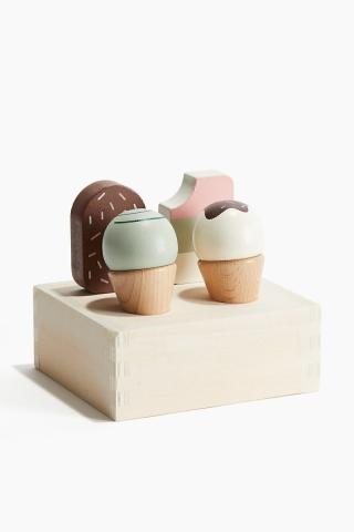 Ensemble composé de quatre jouets en bois en forme de glaces aux designs variés contenus dans une boîte de rangement pouvant également servir de support. Hauteur 5,1 cm. Profondeur 11 cm. Largeur 14 cm.