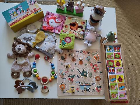 Lot déniché sur la brocante de Forzée contenant : hochet en bois, domino des animaux en bois, jeux d'anneaux lilliputiens en bois et tissus, 2 jeux d'enfilage en bois, 3 livres en tissus, mon premier puzzle jardinage en bois, deux peluches sonores, jeux de clefs pour les dents en silicone et suspension à clochettes en bois.