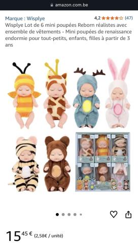 Ce produit est extrait d'une liste de cadeaux (Anniversaire, Noël, ...) déposée sur Kadolog. Kadolog permet de créer des listes de cadeaux (Anniversaire, Noël, ...) en toute liberté. Il est possible d'ajouter toutes vos envies cadeaux et de recevoir les dons directement sur votre compte. Avec les dons reçus, vous êtes alors libre d'aller acheter vos produits (comme ce 'Lot de mini poupées ') où et quand vous le souhaitez.