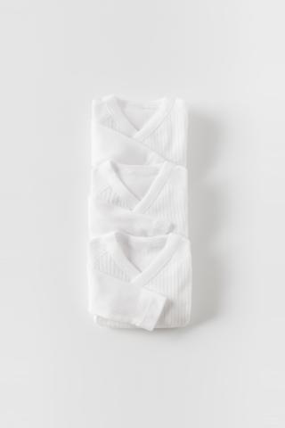 Lot de trois bodys à col kimono et manches longues. Fermeture par boutons-pression à l’entrejambe.