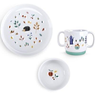 Caractéristiques techniques : - 1 bol.- 1 tasse avec 2 anses.- 1 assiette avec le dessous en silicone antidérapant et amovible.