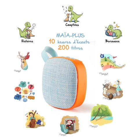 Âge : De la naissance jusqu'à 8 ans. Nombre de titres : 200 titres audio (Comptines, Berceuses, Histoires, Sonorités Zen, Le pourquoi du comment...) Durée d'écoute : 10 Heures La Boite Minimaliste qui chante et qui raconte. MAÏA est conçue pour intéresser intelligemment votre enfant, loin des écrans Avec MAÏA-PLUS