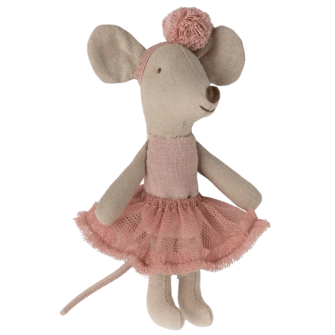 La petite sœur ballerine rose de Maileg, collection danse, fraîchement mise à jour avec une nouvelle nuance de rose, est prête à virevolter et pirouetter.