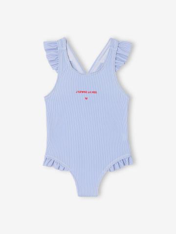 Esprit marin indémodable ! Les rayures aux coloris tendres et les emmanchures volantées accompagnent avec ravissement les premiers bains de bébé !