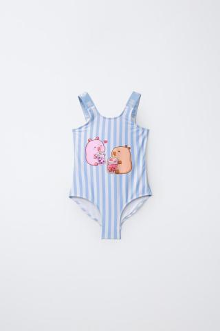 Maillot de bain avec col rond et bretelles élastiques. Imprimé à rayures et CAPIBARA CAPYFUN ©.