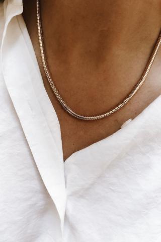 Chaîne en maille serpent ronde. Longueur : 45cm. Plaqué or.