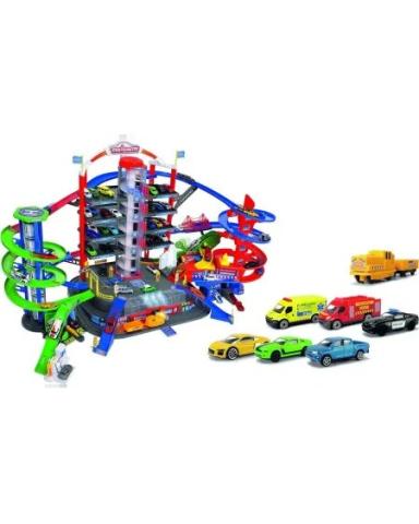 MAJORETTE SUPER CITY GARAGE 7 niveaux de jeu, 2 ascenseurs motorisés, car-wash, station service, 6 véhicules et 1 train motorisé. 128 x 78 x 73 H cm. MAJ212...