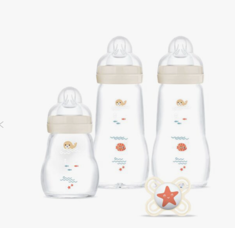 Ce coffret comprend : un biberon en verre 170 ml, 2 biberons en verre de 260 ml et 1 sucette anatomique.