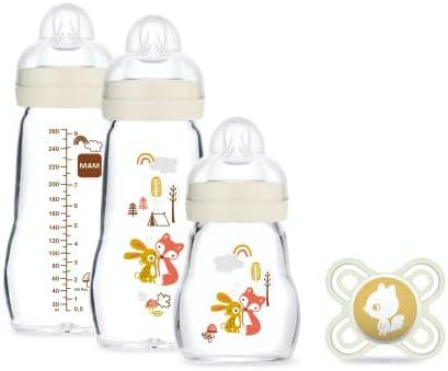 MAMCoffret biberons en verre0 mois et plus Contient : 1 biberon en verre 170ml + 2 biberons en verre 260ml + 1 sucette naissance Coffret complet pour la naissance vendu avec : - 1 biberon en verre 170ml - 2 biberons en verre 260ml - 1 sucette naissance Tétine douce comme la peau, reconnu instinctivement par bébé Verre premium : résiste à la chaleur.