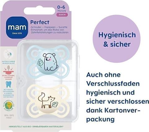 MAM Perfect Lot de 2 tétines, pour un développement sain des dents et de la mâchoire, en matériaux durables et biologiques renouvelables, avec boîte à tétine, pour bébé de 0 à 6 mois.
