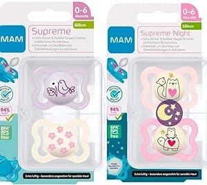 MAM Tétine dentaire Silicone Supreme 0-6 mois +, 4 pièces, comprend 2 conteneurs de transport stérilisés