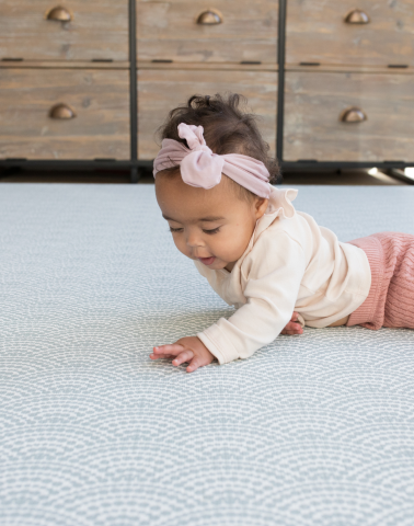 The Mariner playmat feels fresh and subtle, with beautiful sea grass hues that blend oceanic greens and blues, alongside a wave-inspired scallop motif. Stylish for modern family homes, it is made with safe, non-toxic materials and thick, bounce back memory foam for ultimate protection and support. Plus, the wipeable su