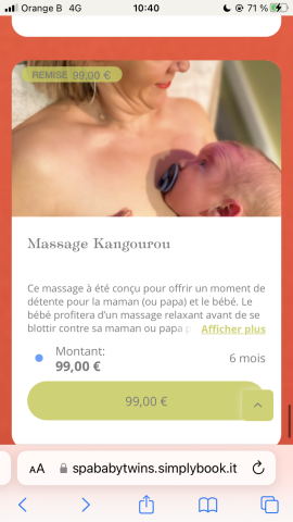 Ce produit est extrait d'une liste de cadeaux (Anniversaire, Noël, ...) déposée sur Kadolog. Kadolog permet de créer des listes de cadeaux (Anniversaire, Noël, ...) en toute liberté. Il est possible d'ajouter toutes vos envies cadeaux et de recevoir les dons directement sur votre compte. Avec les dons reçus, vous êtes alors libre d'aller acheter vos produits (comme ce 'Massage kangourou ') où et quand vous le souhaitez.