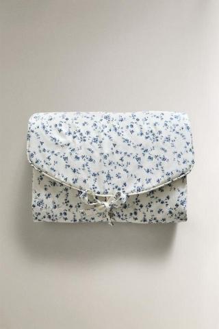Matelas à langer portable pour bébé en coton à motif de fleurs bleues. Fermeture par cordon.