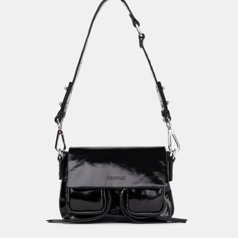 Le mini sac crunch noir est la plus petite version du sac signature max de Neuville. il possède 2 petites poches extérieures et une chaîne. Disponible en ligne à NEUVILLE.