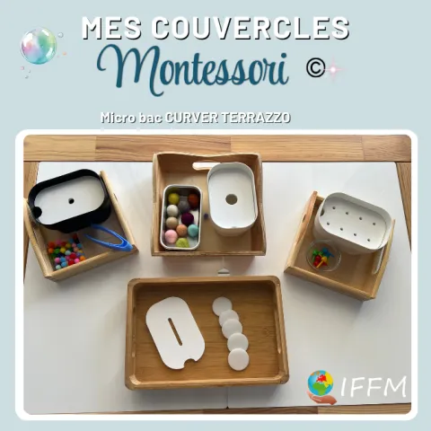 Mon kit de minis inserts Montessori Lot de 4 minis inserts pour tes plateaux Montessori. -Insert trou 2 cm -Insert trou 0.5 cm -Insert fente tirelire -Insert 8 picots En option deux bacs curver terrazo 0.2L