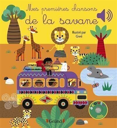 Six illustrations sur le thème de la savane, avec, dans chacune d'elle, une puce sonore permettant d'écouter une chanson : Brousse ma brousse, Un éléphant se balançait, Ouistiti, Jojo l'hippopotame, Le chameau et The animal song.