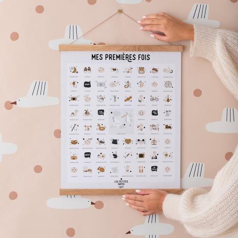 Il y les premières fois qu’on n’oublie pas comme les premiers pas, le premier mot… et il y a toutes les autres ! Qui se rappelle de la date de son premier bobo, de son premier brossage de dent, de sa première bêtise… ? Entre le "premier jour sur terre" et "mon premier trajet en avion"... L’affiche comprend 61 première