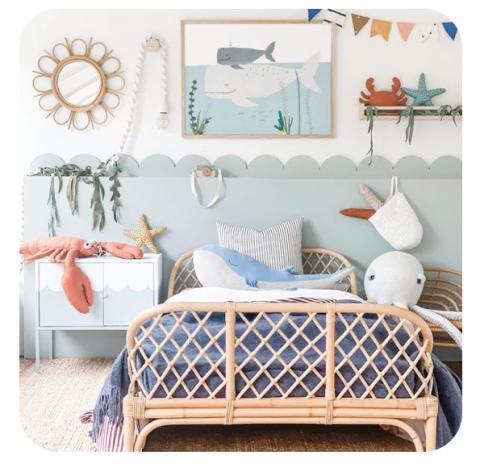 Pour que petit Robert puisse faire de belles et longues nuits paisibles nous souhaitons lui offrir une chambre sur le thème de la mer avec des meubles en rotin et en bois blanc