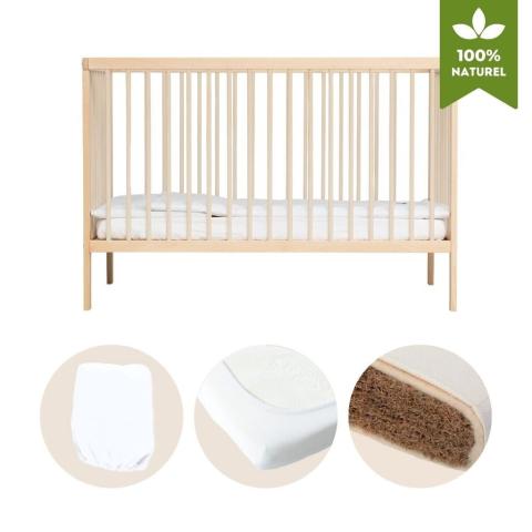 Ce pack est fabriqué avec des matériaux solides et durables, sans ajout de produits chimiques, toxiques ou nocifs, pour offrir un environnement sûr à votre bébé. Cet ensemble 3 en 1 comprend : - 1 lit Mini Mokee® en Hêtre Massif (60 x 120 cm) Le lit bébé parfait au design neutre et scandinave. Fabriqué en Europe à part