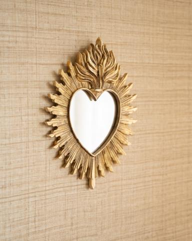 Mirror Heart Gold is een opvallende hartvormige spiegel met een sierlijke gouden lijst en subtiele vlamdetails. Deze decoratieve wandspiegel geeft direct een warme, luxe uitstraling aan je interieur en is perfect voor de hal, slaapkamer of boven een dressoir. Een echte eyecatcher in hotel chique, vintage of romantische