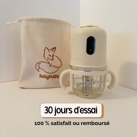 Le mixeur bébé portable BabyVulpy a été conçu pour accompagner les parents dans la préparation de repas frais, sains et faits maison, à la maison comme en déplacement. Grâce à son bol en verre borosilicate, ses lames en inox 316 et sa batterie rechargeable longue durée, il permet de mixer purées, compotes, morceaux fon