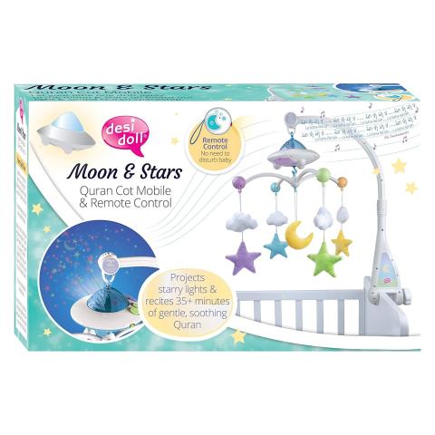 Accroché au-dessus du lit de bébé, ce joli mobile coranique spécialement conçu pour les bébés musulmans, tourne, s'illumine et diffuse du Coran. En observant la lune et les étoiles, votre bébé s'endormira au son d'une douce lecture du Coran (+ 35 min). Un cadeau de naissance original et enchanté, décoratif et utile. La télécommande permet de contrôler toutes les options du mobile à distance.