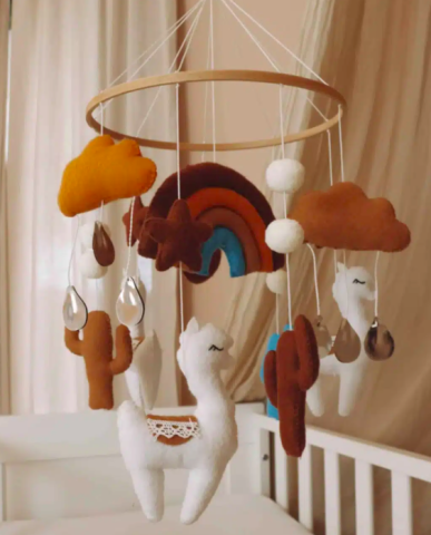 Little Loua, un mobile en feutre fait main avec des petits lamas tournoyant pour accompagner les rêves de notre fille
