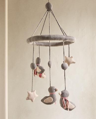 Mobile pour lit bébé avec peluches en forme de petits canards en coton.