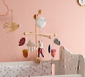 Mobile musical pour éveiller la vue et l'ouïe de bébé, puis l'endormir tout en douceur. Sur une structure en bois, une petite souris danse au milieu de nuages et récoltes de la forêt… avant de rejoindre le pays des rêves.