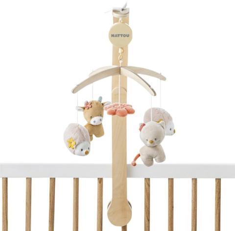 Laissez votre bébé profiter de la célèbre mélodie « Le-La-Lu » du mobile en bois pendant que Mila, la joyeuse vache, Lana, le chat malicieux, et Zoe, le charmant hérisson, tournent doucement.