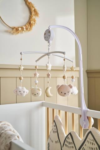 Pour s'endormir paisiblement, bébé regarde tourner les petits nuages et oursons ! Accrochez le mobile aux barreaux du lit et tournez le bouton pour actionner la douce mélodie qui apaisera bébé et l’accompagnera tend