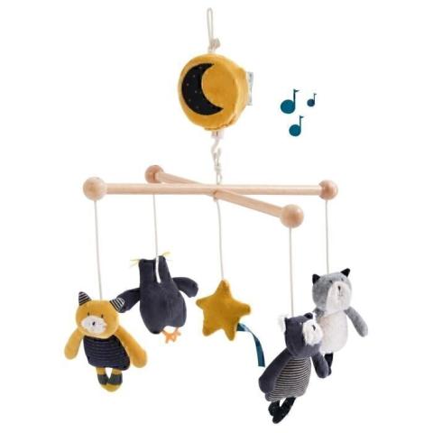 Un trio de chats musiciens qui swinguent au-dessus du lit ? Oui, s’il vous plaît ! Ce mobile tout doux et couleur moutarde (of course !) berce bébé au son d’une douce mélodie pendant que papa rêve secrètement d’un groupe de jazz félin. À suspendre sans modération ! 🎶🐱⭐