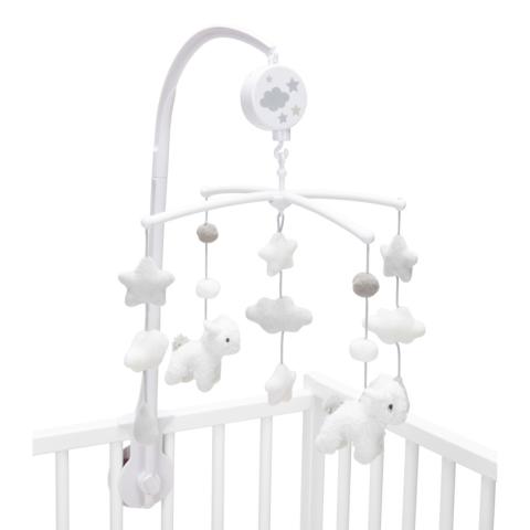 Un joli mobile pour veiller sur bébé et l'apaiser avant son sommeil. 4 suspensions avec peluches mouton, nuage ou étoile. Étau à fixer sur le rebord du lit à barreaux.