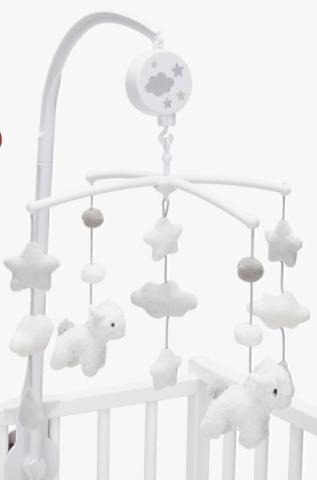 Un joli mobile pour veiller sur bébé et l'apaiser avant son sommeil. 4 suspensions avec peluches mouton, nuage ou étoile. Étau à fixer sur le rebord du lit à barreaux.