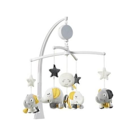 Mobile musical éléphant et étoile gris et jaune.