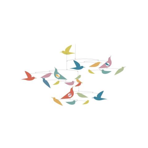 Un joli mobile polypro oiseaux multicolores de la marque Djeco. Idéal pour aller avec la fresque collaborative de silhouette d'oiseaux que nous avons fait dans la chambre de Pistache !