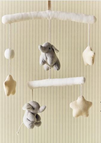 Mobile pour lit bébé avec des peluches en forme d’éléphants et d’étoiles en coton.